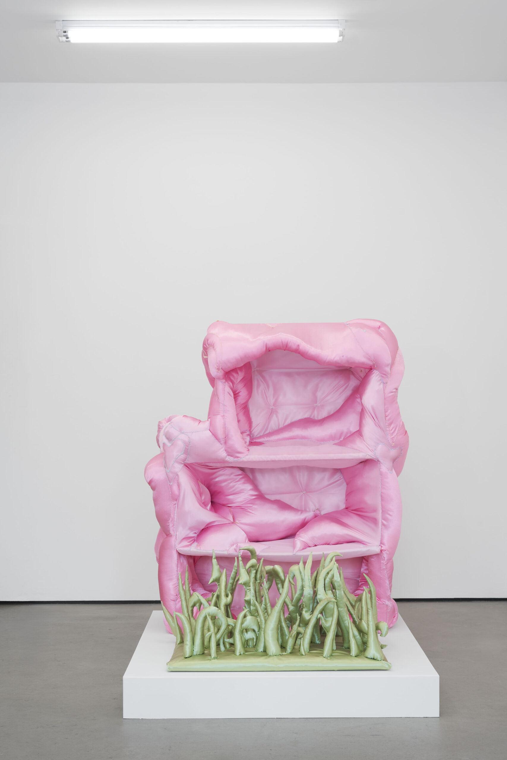 For this exhibition, DaddyBears presents a previously discarded doll’s house redecorated with bulbous, baby-pink upholstery and adorned with delicate, hand-sewn detailing and additional beaded embellishment. What was once considered to have served its playtime purpose is instead revived and ready to be made home to by the artist’s own unseen assembly of bestie bears and floppy bunnies. Alongside, in an ode to Polly Pocket-esque play-set expansion packs, a lush front lawn is already being enjoyed by Burger, the neighbours’ puckish pet rabbit runaway. Nearby, one of Hoy’s melancholic band of Bears Who Care has found itself mounted to the dismembered front bumper of a Dodge pick-up. Similarly sourced from local charity shops, city streets and online auction sites, the artist takes once abandoned soft toys and puts them through a compassionate repairing process. Invariably involving both the physical inversion of their plush form as well as a more figurative inversion of their capacity to offer care and comfort, Hoy’s pearl-teared teddies question the inherent loyalty lifespan of our once preferred playthings.