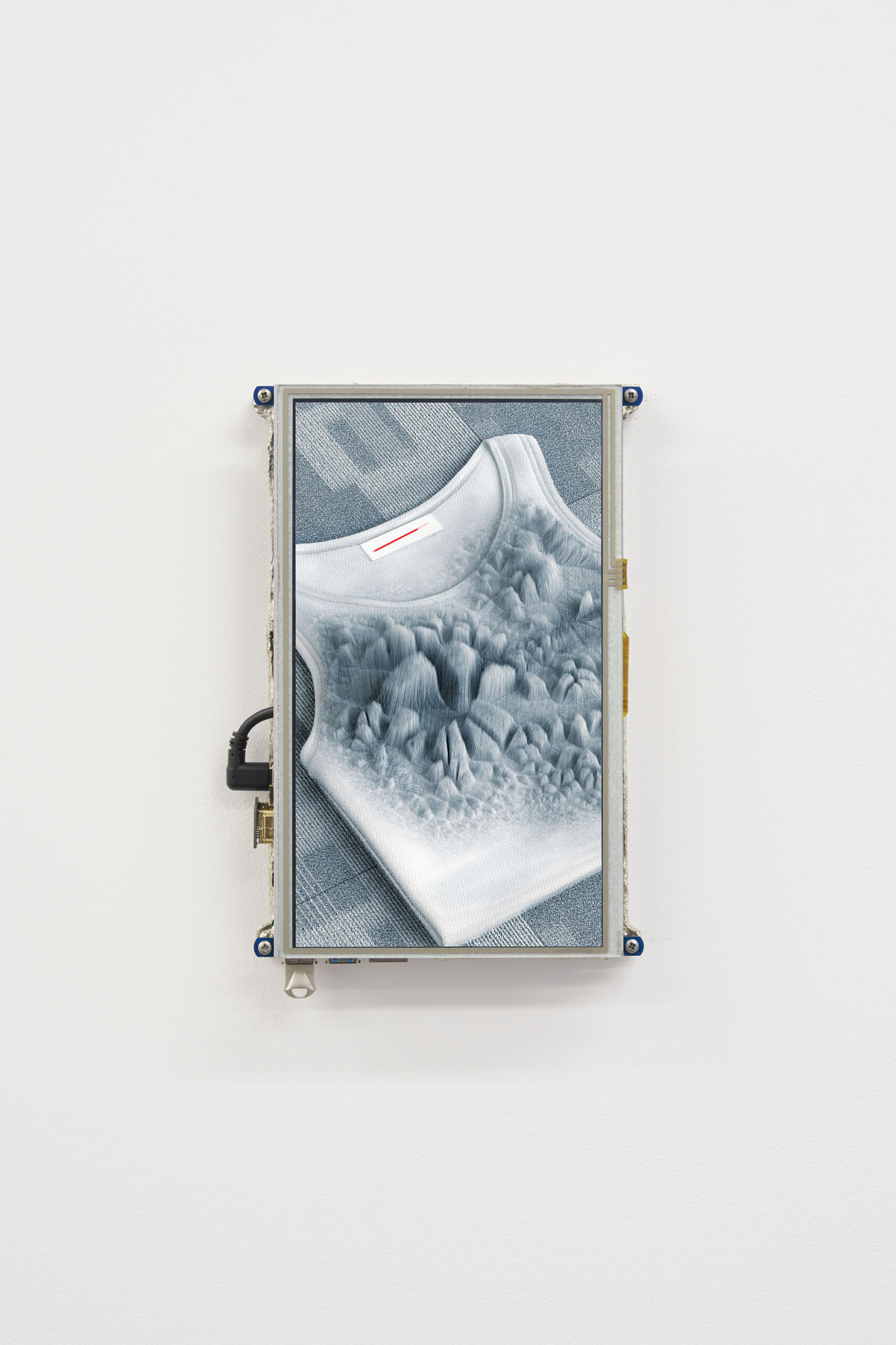 Finally, Le Swer’s animated vignettes of a standard issue starched white shirt and common cotton vest at once expose and exalt the drudgery of daily life. Diligently recreated through 3D rendering, these seemingly box fresh articles of clothing appear to sprout pulsating patches of simulated spores or topographical constellations of artificial follicles. Resulting from the artist’s research into how ecological relations between human and nonhuman agents materialise and reveal themselves, each Not-Fresh short film serves as a voyeuristic insight into our unavoidable and at times uncompromising corporeality.